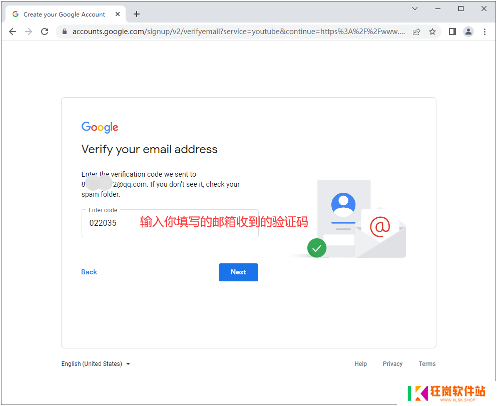 5.在该页面,您需要输入您填写的邮箱收到的验证码,然后点击“Next”按钮。