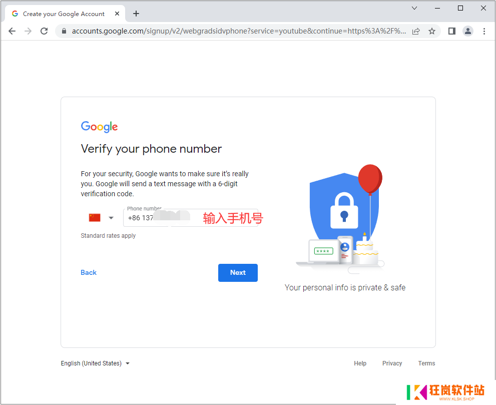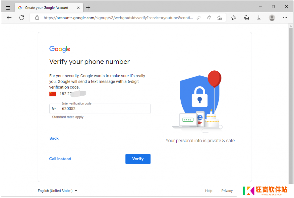 8.输入您收到的手机验证码,很多人在这一步就无法进行下去,主要是浏览器没有使用英文,而导致接受不到验证码,被谷歌提示“此电话号码不能用于验证。”。