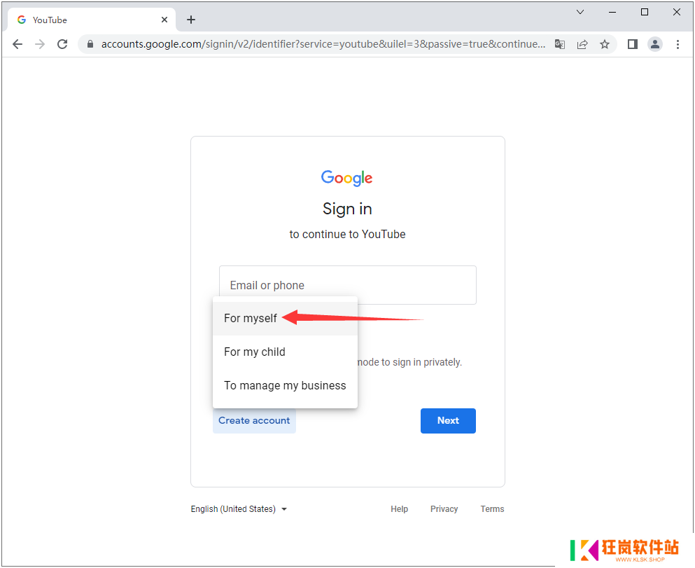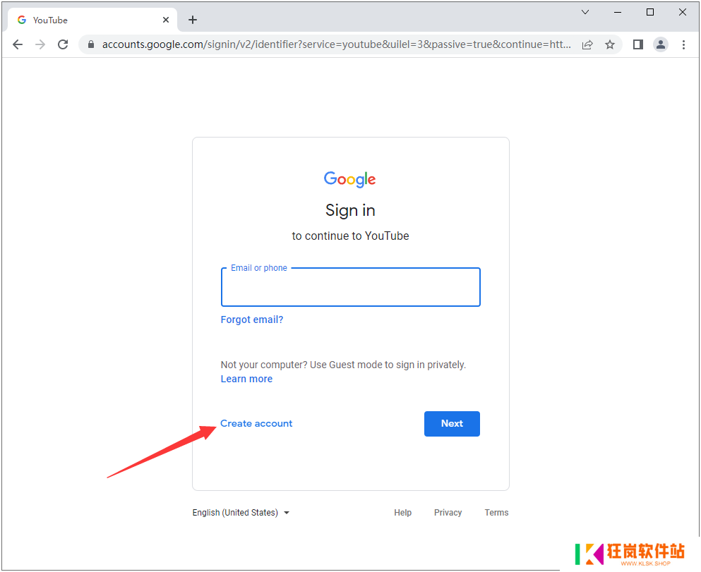 2.然后会跳转到谷歌的注册界面(因为谷歌和YouTube是一家公司的产品),我们点击底部“Createaccount”按钮。