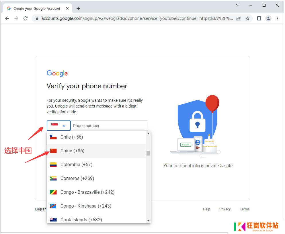 6.在该页面,我们需要选择您所处国家的手机区号,如果在中国境内,您需要选择“+86”的区号。