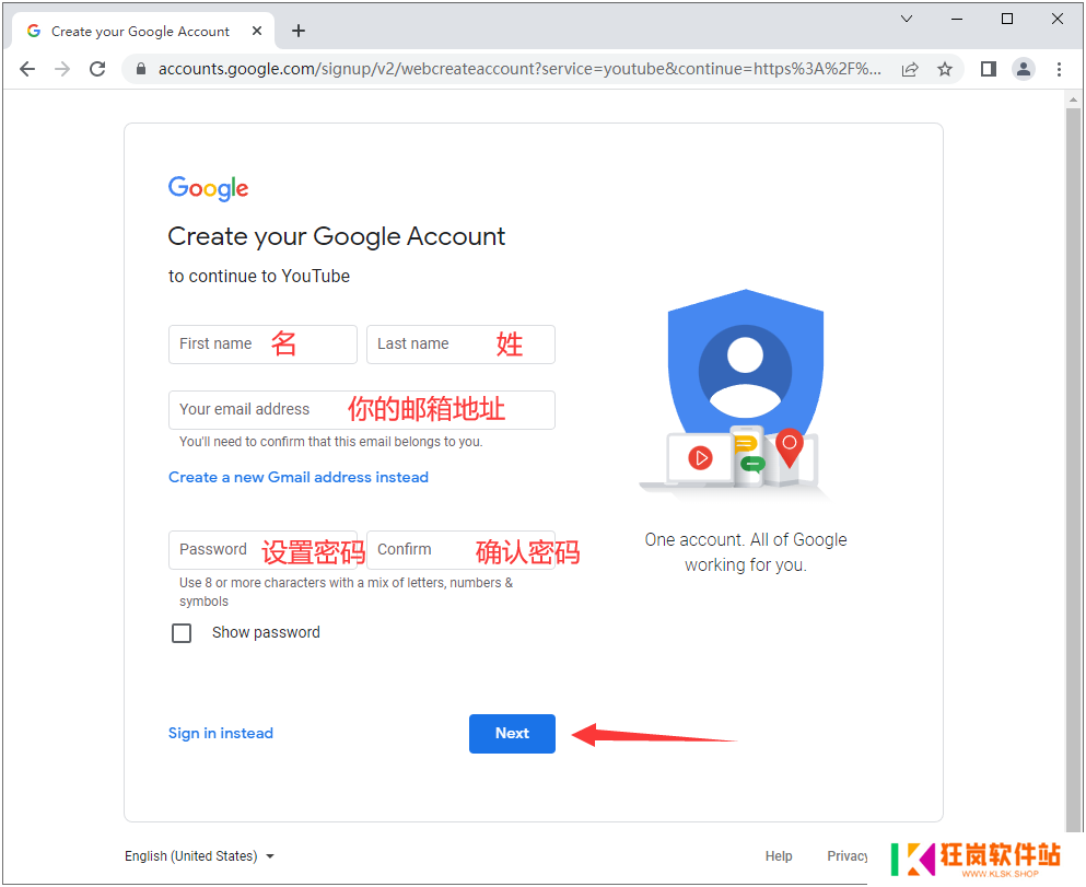 4.在该页面,我们会被要求填写名、姓、你能接收验证码的邮箱地址、设置谷歌账号的密码、以及确认密码,然后点击“Next”按钮。