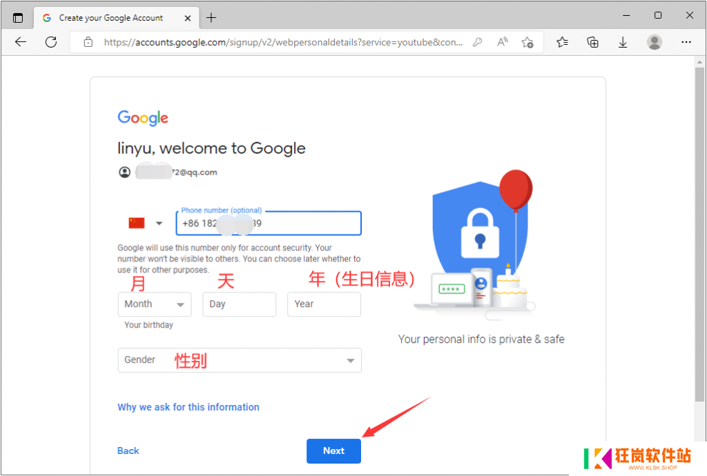9.输入您的生日信息,包含年、月、日、以及性别。