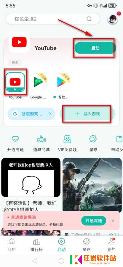 2.打开OurPlay点击【导入游戏】,选择【YouTube】进行导入,导入完成后再次选择【YouTube】然后点击【启动】