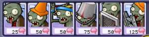 6、将路障僵尸分别放在第一、四条线,并在第三条线放撑杆僵尸。
