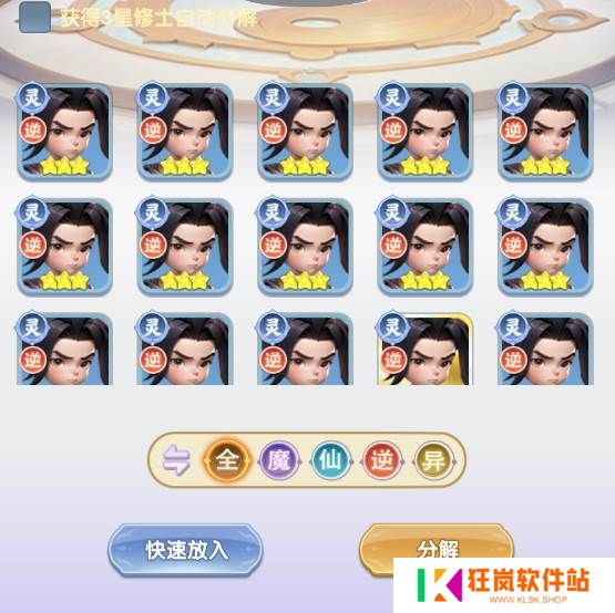 修士分解后,返还所有培养材料(包括升级材料、进阶材料、升星材料)。值得一提的是,分解部分星级的修士还可获得精魂,可以在修士坊市里兑换五星修士碎片。