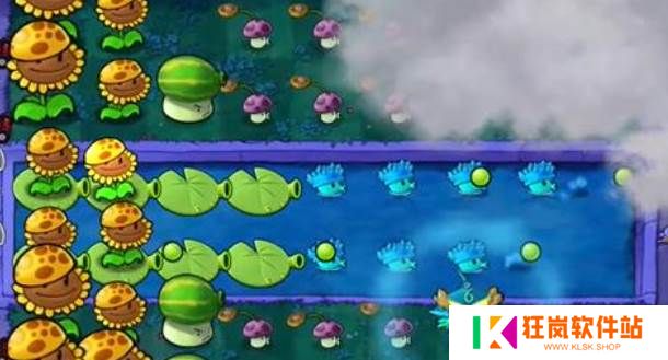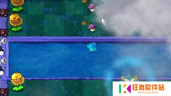 3、在泳池中种植三个寒冰小喷菇,在右侧补充两个6号路灯。