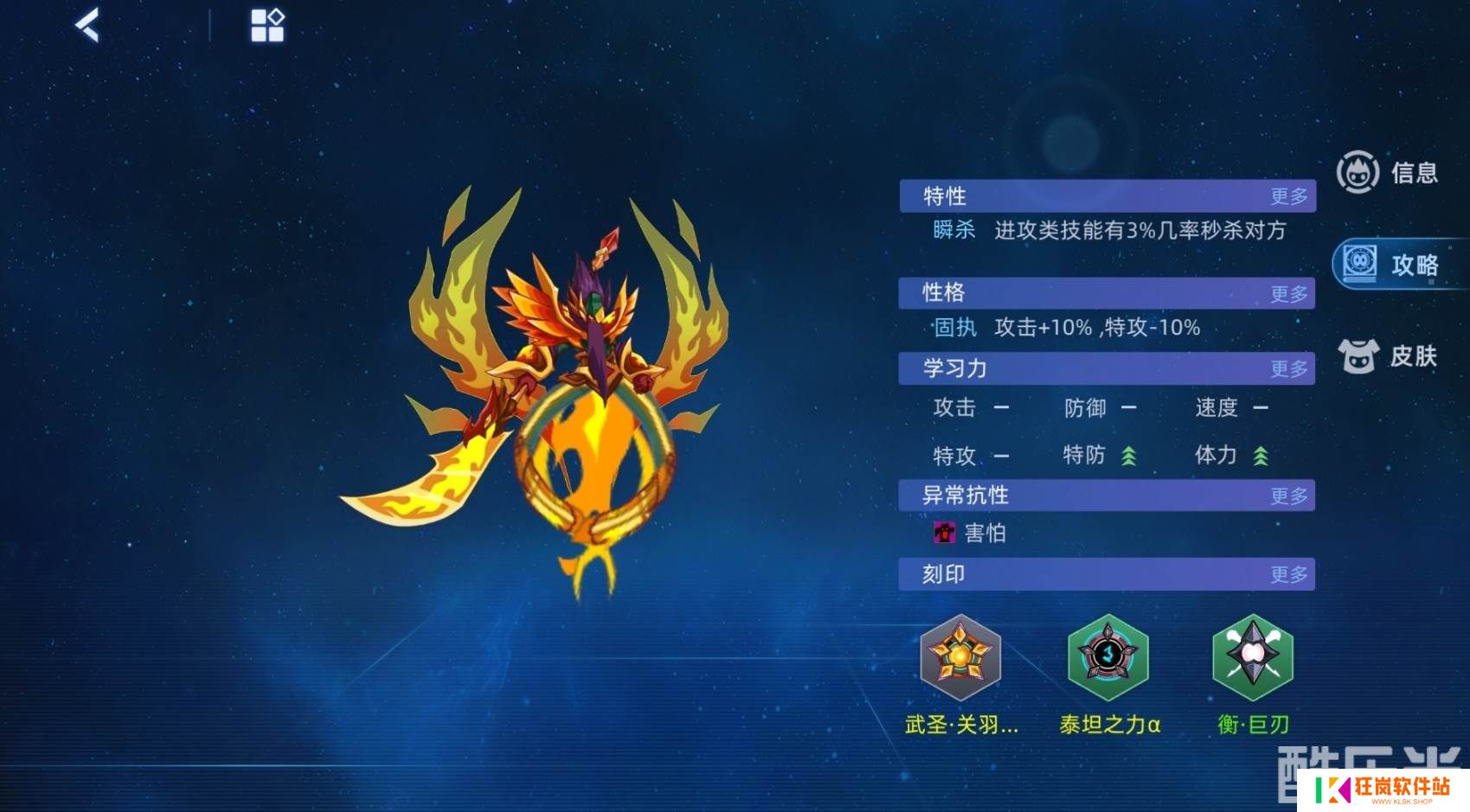 从特性上来看,武圣关羽是比较注重防御的精灵,所以在学习力的加点最好以特防和体力为主,并且只要在特性上洗出瞬杀,那么这只精灵的战力会非常强。刻印的搭配优先考虑它的专属刻印,能为它加不少所需的属性,其它的刻印最好以特防和体力为主。