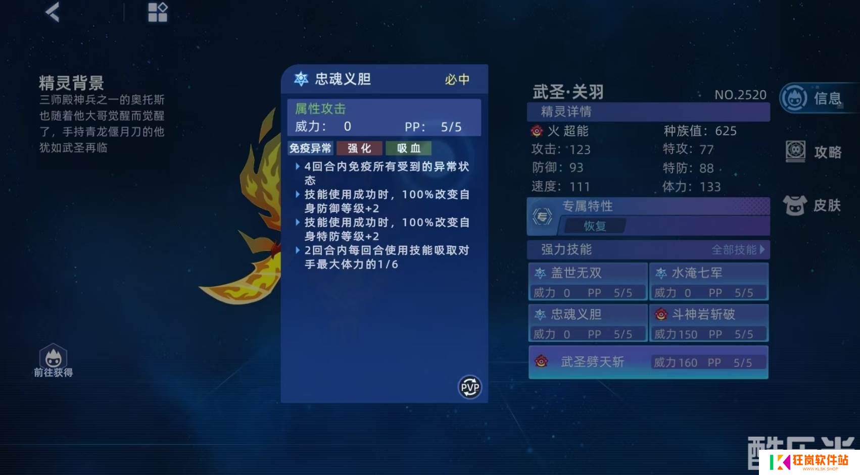 在技能方面,这只精灵的核心技能为能免疫异常、可吸血且能强化自身的忠魂义胆,以及伤害很出色的斗神岩斩破和第五技能武圣劈天斩,搭配上盖世无双和水淹七军这两个技能会令它又能打又能抗。当然,也可根据对战情况选择搭配千里单骑或青龙偃月斩出战。