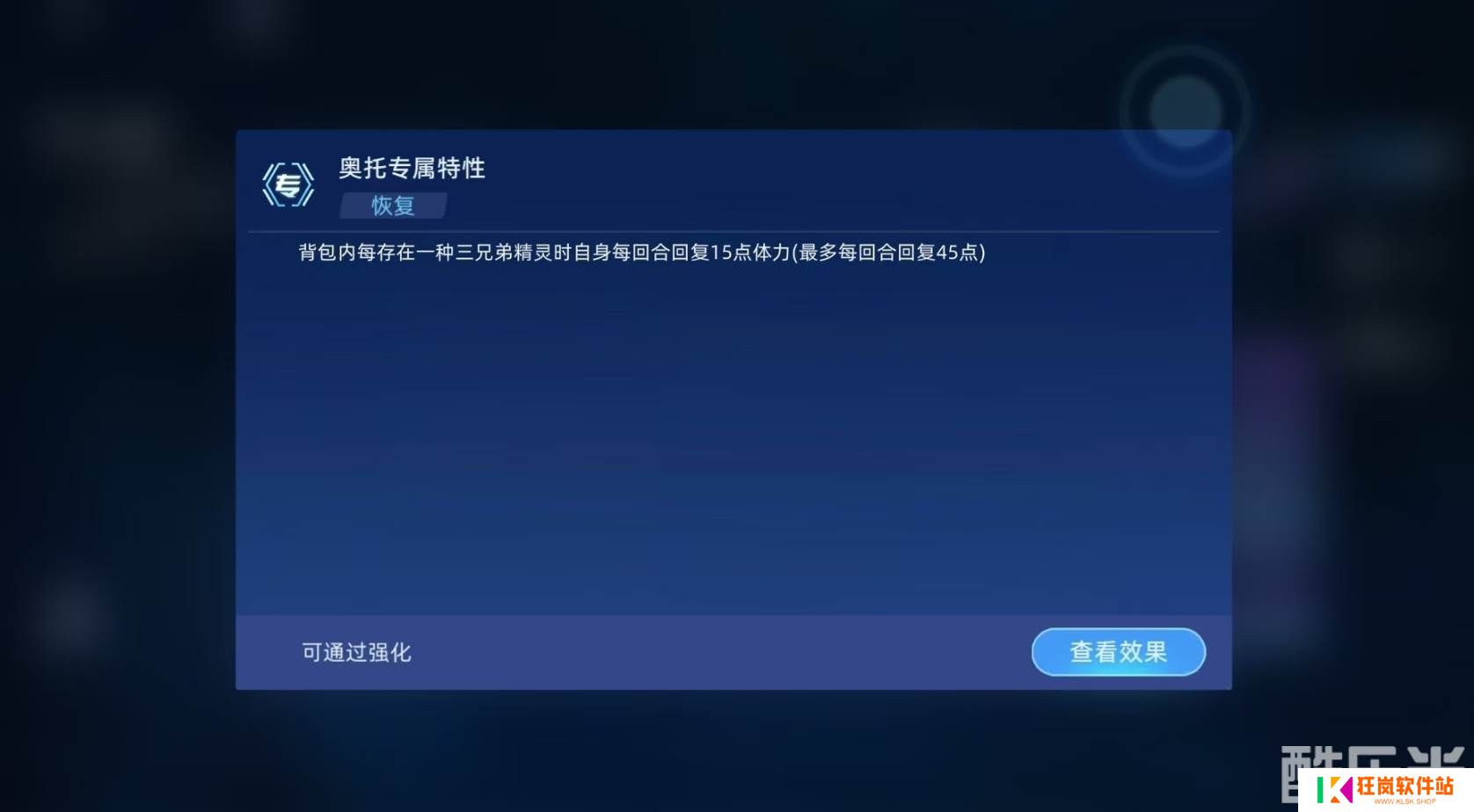 武圣关羽是火属性的精灵,它的专属特性非常独特,只要背包里每存在一只三兄弟精灵,它每回合都能自动恢复一定的体力,每只三兄弟精灵可为提供15点的体力恢复,上限为45点,在对局节奏不是那么快的战斗里非常有优势,更何况为它提供助力的三兄弟精灵只需待在背包里就行,不占用出战名额。
