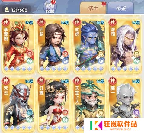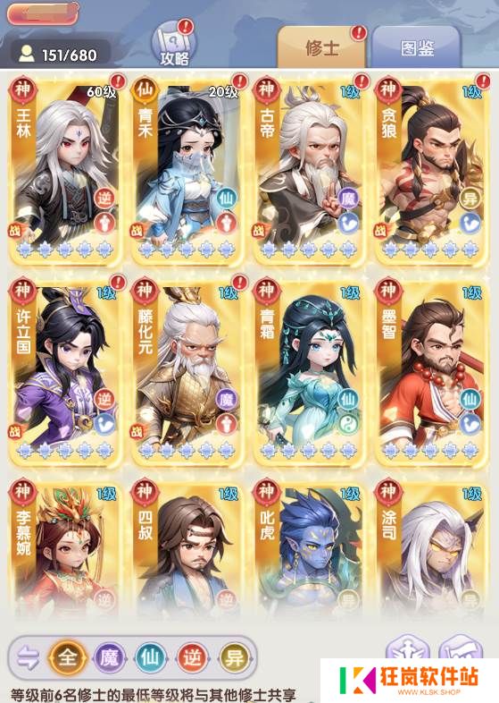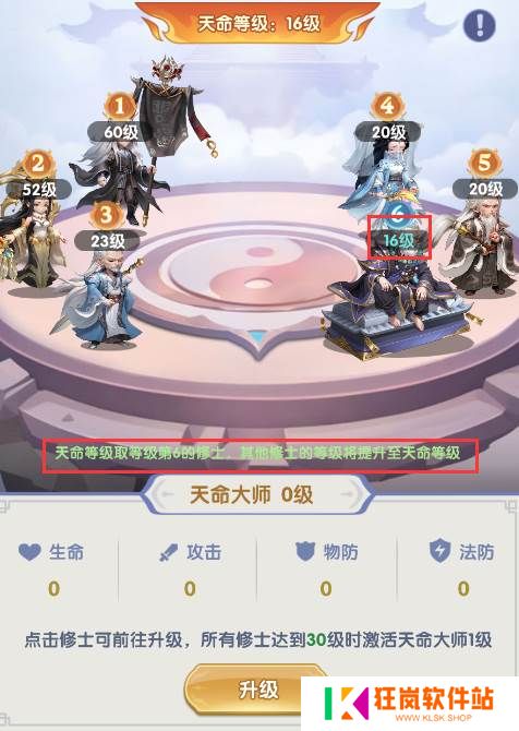 上面两张图,图1天命界面显示某位道友的6位等级最高的修士中,最低等级为16级,图2回到修士页面,这位道友其他的非等级前6的初级修士均可共享16级。